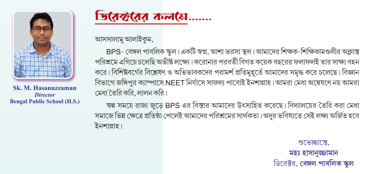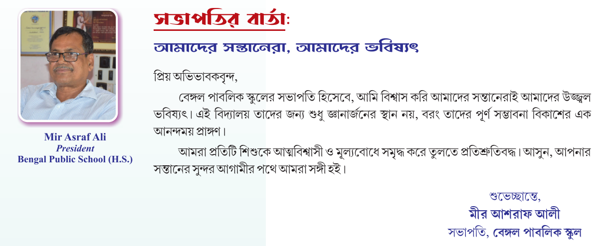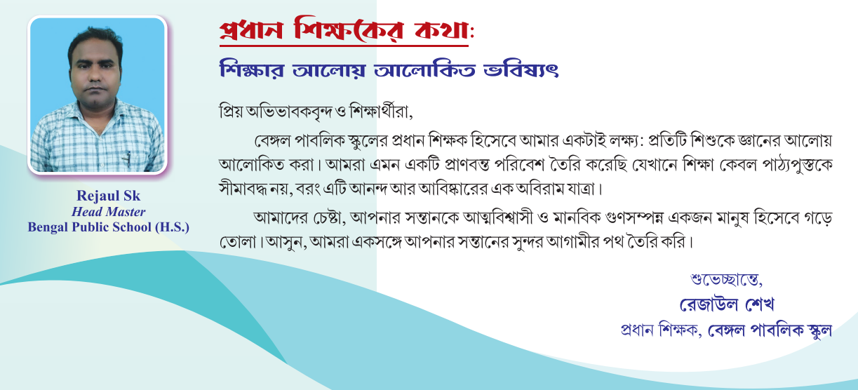 I believe that education is not confined to books and examinations alone. It is a holistic process that supports the physical, mental, and moral development of students. Bengal Public School has been working with this vision in mind. If there are any shortcomings in our efforts, you—our well-wishers—will be the best judges.